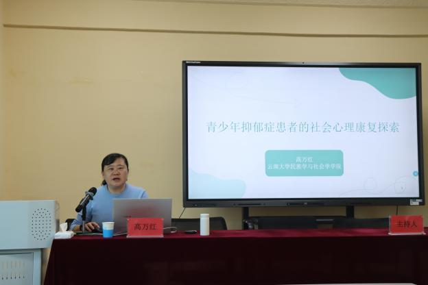 高万红教授以《青少年抑郁症患者社会心理康复的实践探索》为题,围绕其研究背景、理论基础、问题提出、实践路径及展望等展开,阐述了系统的社会心理康复干预方案,并指出此干预方案促进抑郁症青少年的康复、帮助其重返校园和融入社会方面取得的效果。最后高教授与师生进行交流互动,一一回应老师和同学们提出的相应问题。